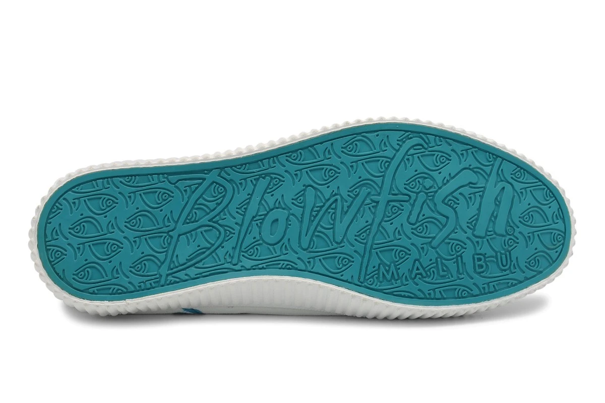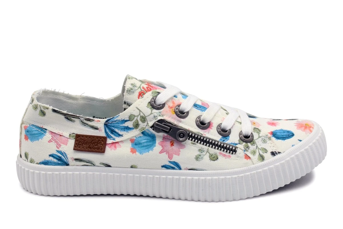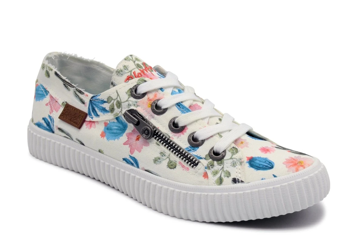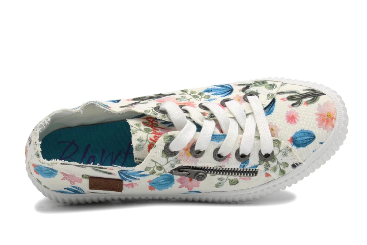 Blowfish Coyote women’s trainers have a white canvas upper that’s soft and flexible, with lightweight comfort and raw seam frayed edges. The fun ‘prickly’ print features a pretty pink, blue and green floral cactus print that creates a cute summery look. The classic low top style has an on-trend white ribbed rubber sole bumper, a teal colour flexible traction outsole plus lightly cushioned insoles for added comfort. Blowfish Coyote women’s fashion shoes have a front lace up fastening with the Blowfish coral colour script logo embroidered on the tongue, plus a side tan faux leather logo badge and a feature mock side zip.