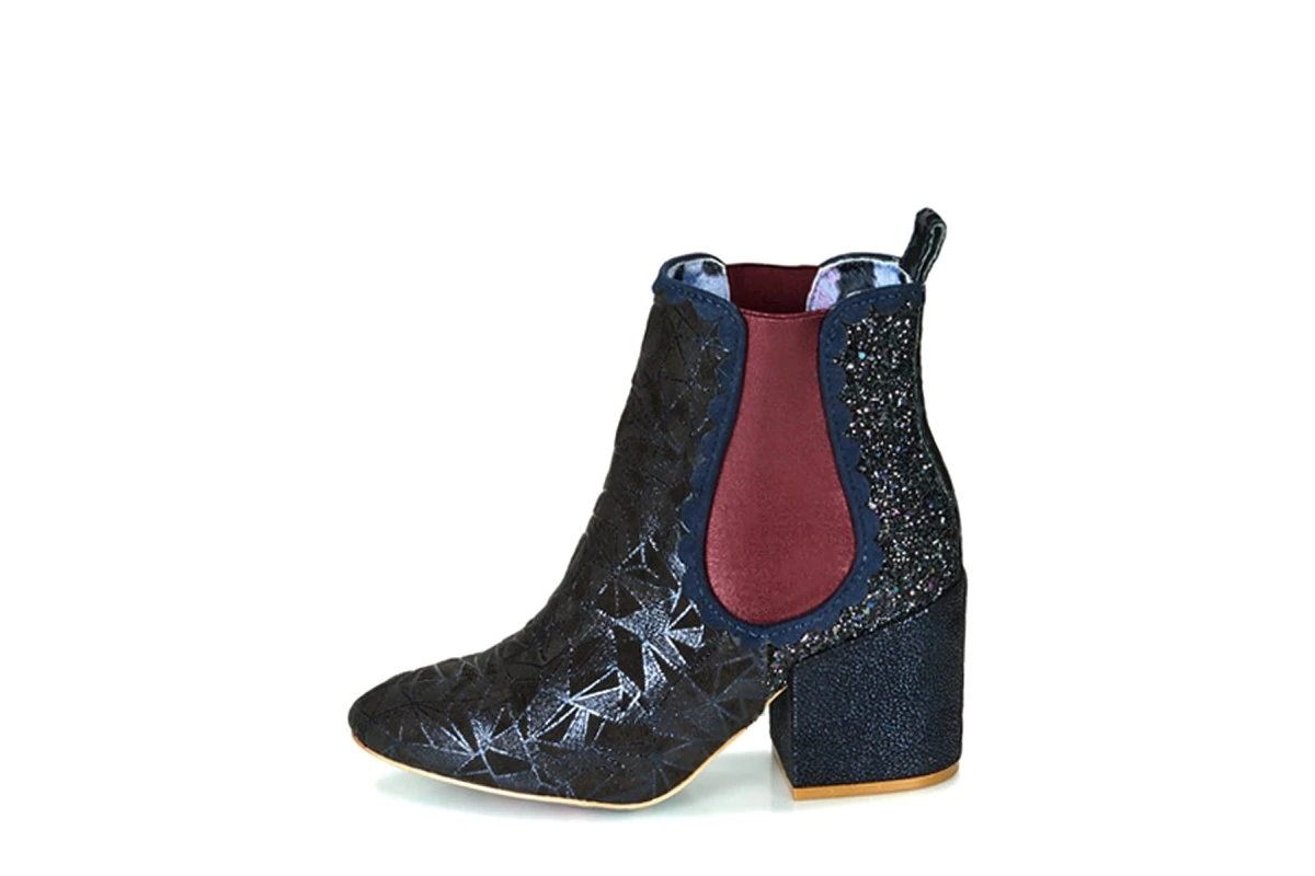 Irregular Choice Kings Road ankle boots are perfect for making a statement this winter. The navy blue geometric print fabric upper has a stylish metallic finish teamed with a stunning glitter back panel and navy faux suede scallop trims. These women’s fashion boots have a simple slip-on Chelsea boot style with contrasting colour burgundy shimmer stretch fit side panels for an added pop of colour. Irregular Choice Kings Road ankle boots also feature a chunky block heel with a cracked metallic finish, a sleek almond shape toe and a star print stripe at the back of the boot. Fun and colourful printed soles complete the iconic Irregular Choice look.