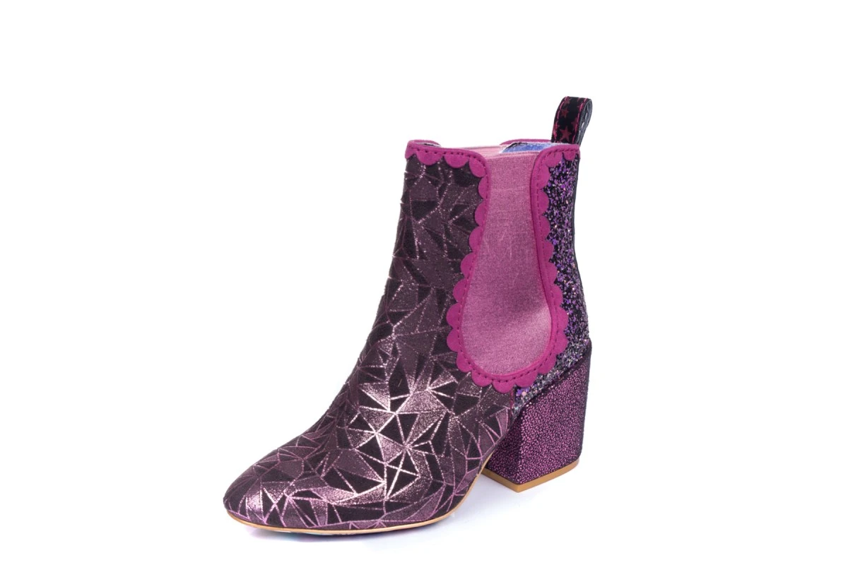 Irregular Choice Kings Road ankle boots are perfect for making a statement this winter. The black fabric upper has a stylish pink metallic geometric print teamed with a stunning glitter back panel and purple faux suede scallop trims. These women’s fashion boots have a simple slip-on Chelsea boot style with pink shimmer stretch fit side panels for an added pop of block colour. Irregular Choice Kings Road ankle boots also feature a chunky block heel with a cracked metallic finish, a sleek almond shape toe and a star print stripe at the back of the boot. Fun and colourful printed soles complete the iconic Irregular Choice look.