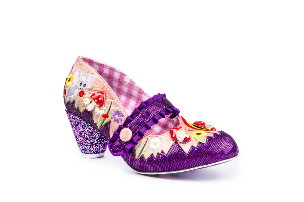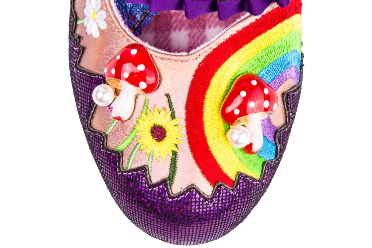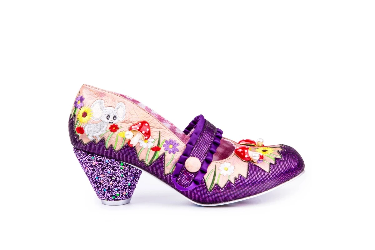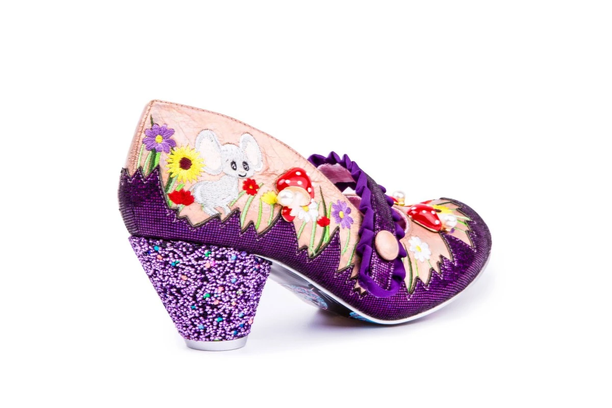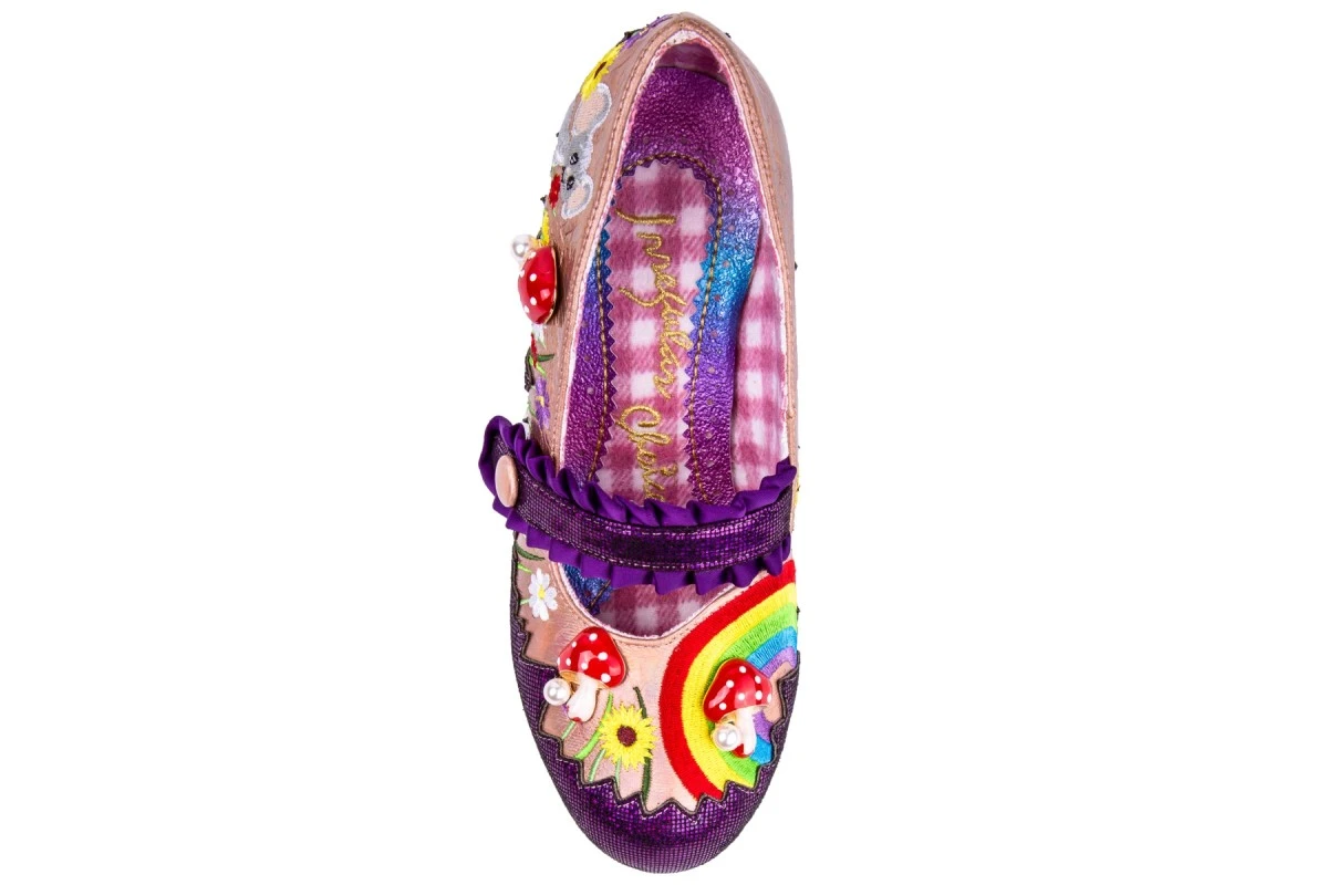 The fun and colourful design of these new Irregular Choice Pipsqueak shoes is sure to brighten your day. The champagne colour faux leather upper is decorated with fresh flower and grass embroidery with a bright rainbow embroidered at the toe. The classic mary-jane style has a purple satin pleated strap with a cute champagne gold colour covered button and a quick hook and loop fastening underneath. The metallic purple mini check-textured fabric stripe across the strap also decorates the side of the shoe with an irregular zigzag design. Irregular Choice Pipsqueak fashion shoes have a sleek round toe teamed with a chunky cone shape block heel covered in sparkly purple glitter curls and a few multi-coloured glitter hexagons for added wow factor. Irregular Choice have completed the fun woodland scene with super cute glossy red toadstool charms and a grey embroidered mouse character at the heel. These bold statement shoes also feature the ‘Space Station’ printed outsoles with planets, stars, crescent moons and cute kittens. There’s also a soft brushed fabric shoe lining and cushioned insoles.
