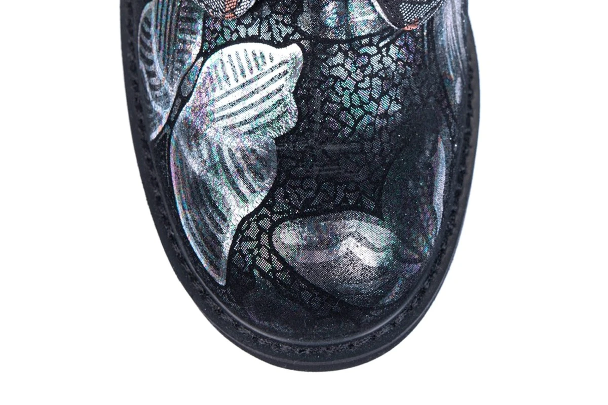 Irregular Choice Quick Getaway women’s ankle boots have a black leather upper decorated with a stunning iridescent butterfly print. The floral embroidered tapestry brocade style fabric overlay lace-up panels feature a vintage inspired woven floral design with silver and bronze metallic detailing. Irregular Choice Quick Getaway fashion boots have a classic round toe plus an on-trend block heel. The oversized silver colour metal eyelets and wide black satin ribbon laces completes the statement style.