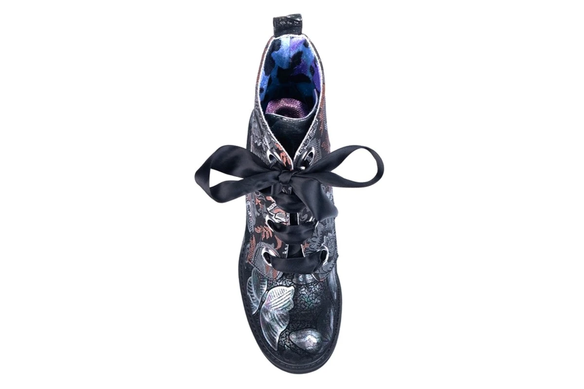 Irregular Choice Quick Getaway Black Floral Bronze Silver Block Heel Lace Up Ankle Boots