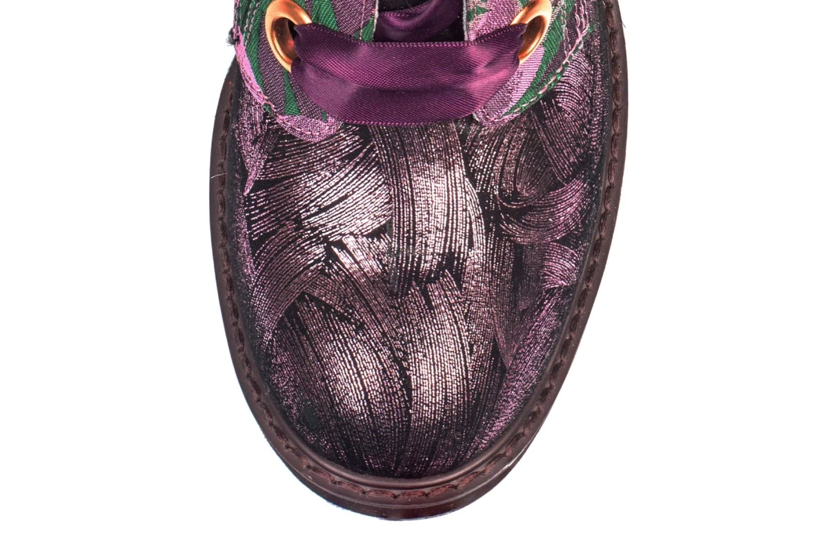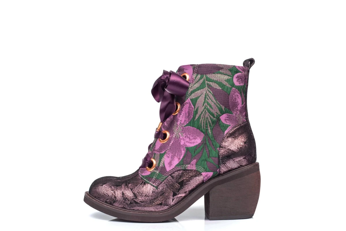 Irregular Choice Quick Getaway women’s ankle boots have a black leather upper with a stunning rose gold metallic brushstroke finish. The stunning floral embroidered tapestry style fabric overlay features dark pink and green woven fabric upper with shimmering green metallic detailing. Irregular Choice Quick Getaway fashion boots have a classic round toe plus an on-trend wood effect brown block heel. The oversized gold colour metal eyelets and wide satin ribbon laces in a gorgeous deep purple colour completes this statement style.