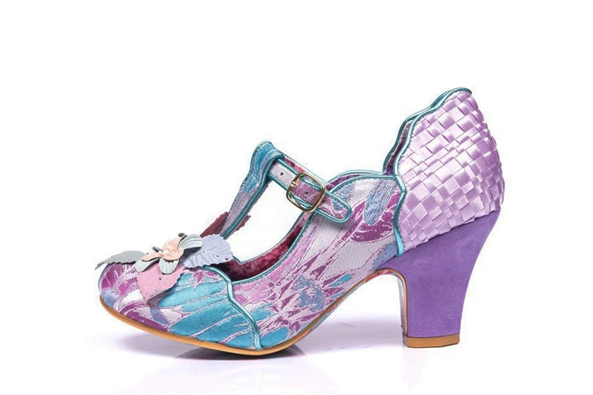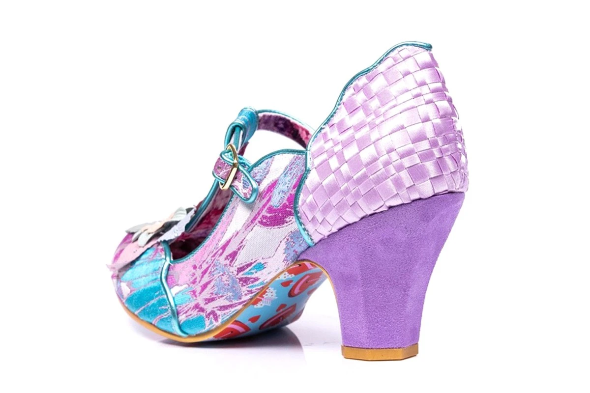 These new Irregular Choice Windermere shoes combine cute pastels with rich purple and turquoise for a summery look. The classic round toe and T-strap design has a fresh update with the addition of a sculpted column heel and scallop shape edges with turquoise trims. The lilac woven ribbon heel panel and smooth faux suede heel creates a beautiful contrast to the abstract woven fabric upper. Irregular Choice Windermere fashion shoes also feature a pretty posy of pastel appliqué flowers at the toe decorated with little faux gems. The colourful printed soles have this season’s new love heart design.
