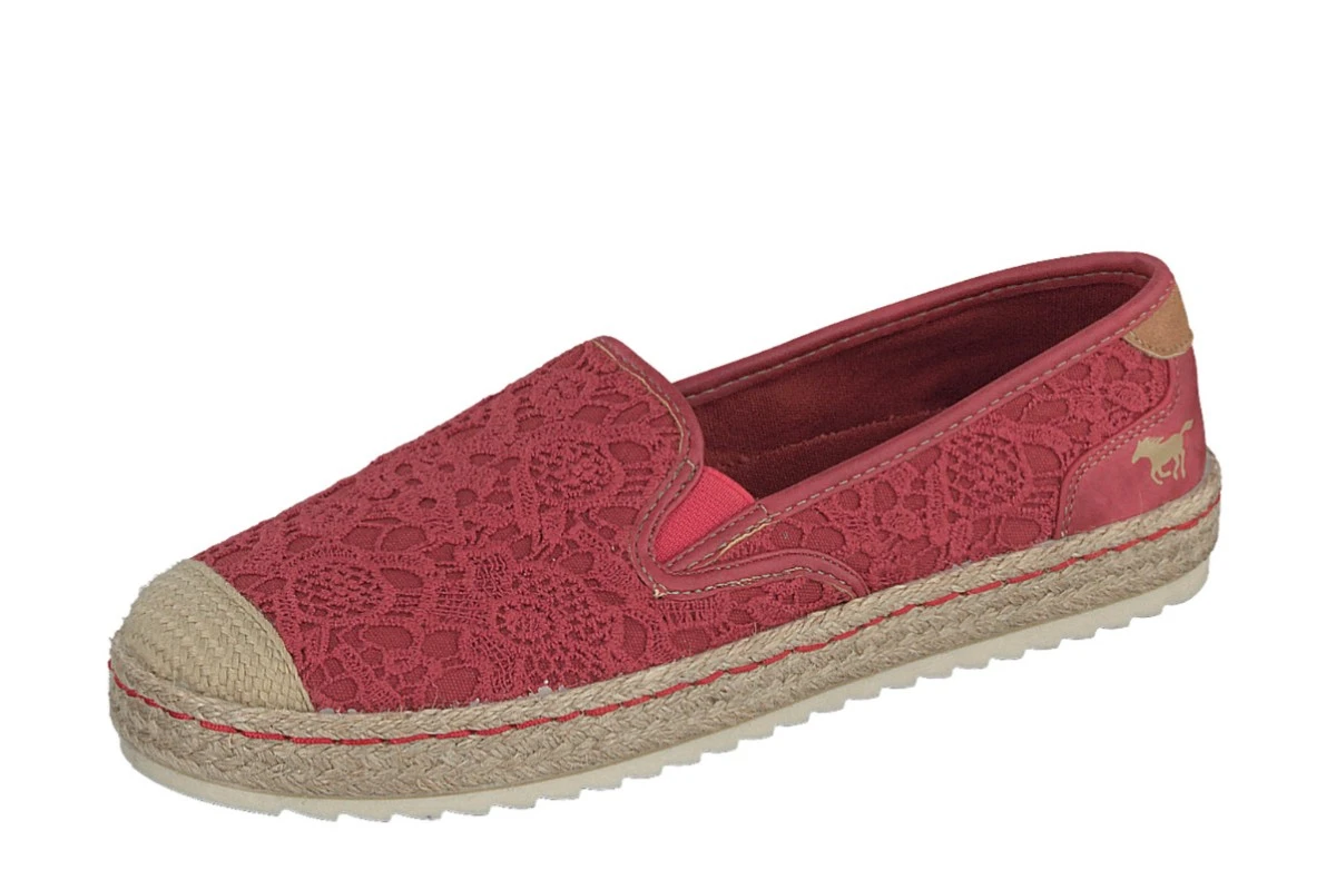 Mustang 1245-207 women’s shoes are perfect for casual summer days, The red canvas upper features a stylish floral lace overlay teamed with red faux leather trims. These women’s fashion shoes have a simple slip on style with a elasticated side panels. The round toe has a natural colour plaited hessian finish which is matched around the edges of the sole for a perfect summer espadrille look. Mustang 1245-207 flat shoes also boast a flexible rubber outsole which adds to the comfort and the Mustang horse logo appears at the heel.