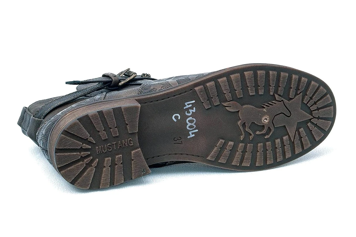 These Mustang 1265-515 women’s ankle boots have a fashionable western style with a brown textured faux leather upper in an abstract pattern. The smooth faux leather panels at the back of the boot are teamed with a stunning wrap around strap that features decorative metal studs and a Mustang branded buckle. These winter fashion boots have a low block heel, a classic round toe and textured rubber soles for good grip. Inside the boot there’s a soft faux fur lining plus there’s a side zip for quick and easy fastening.