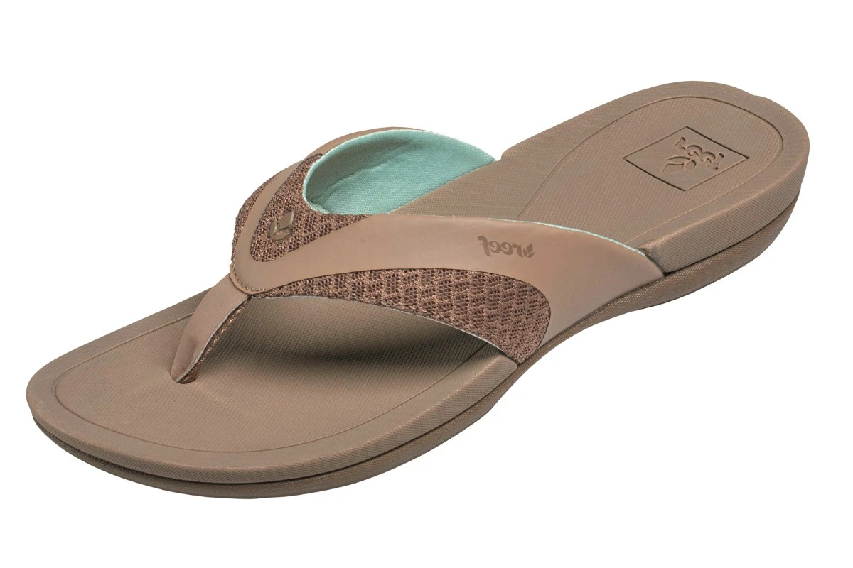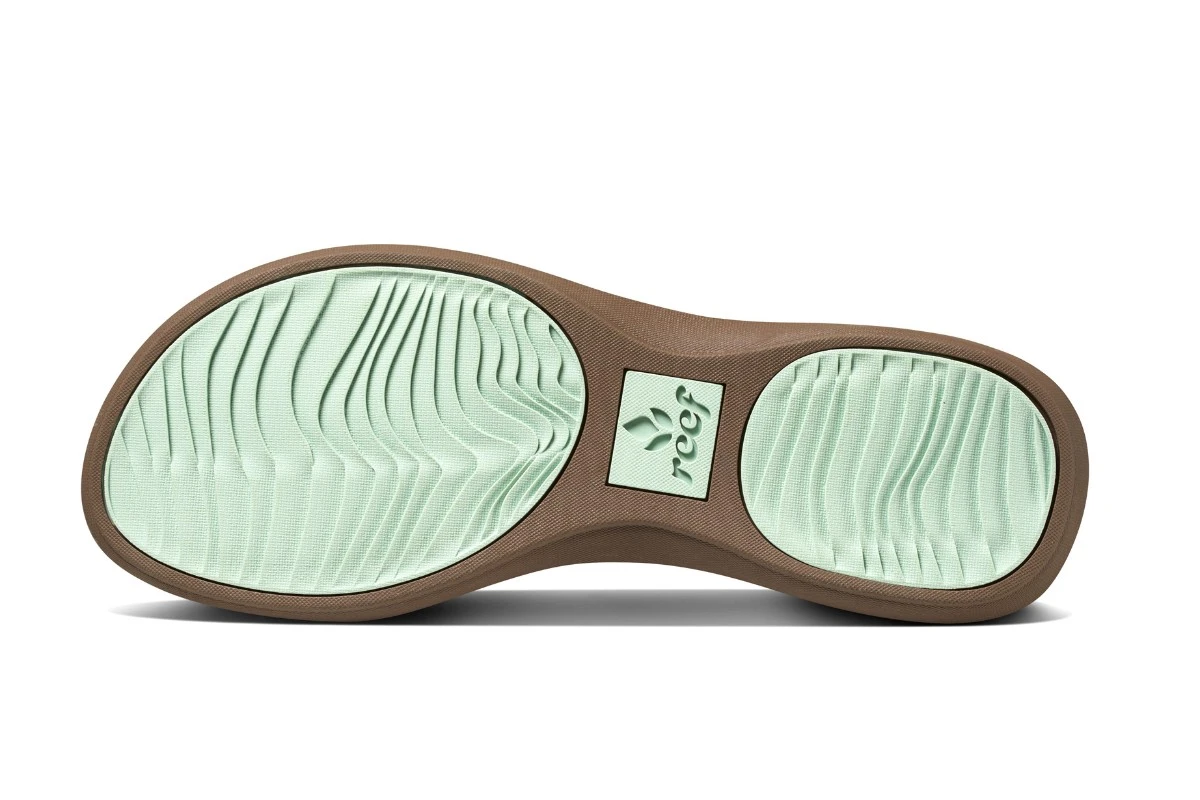 Reef Energy women’s sandals have a stylish athletic design. The thong strap is made from soft mesh fabric teamed with smooth faux nubuck and a flexible fabric toe post for ultimate comfort. The anatomical footbed has contouring arch support and forefront sculpting for added comfort. Reef Energy flip flops also feature a cushioned EVA footbed with a low wedge heel and textured rubber outsole for good grip. The versatile taupe colour is teamed with mint green on the inside of the strap and on the sole.