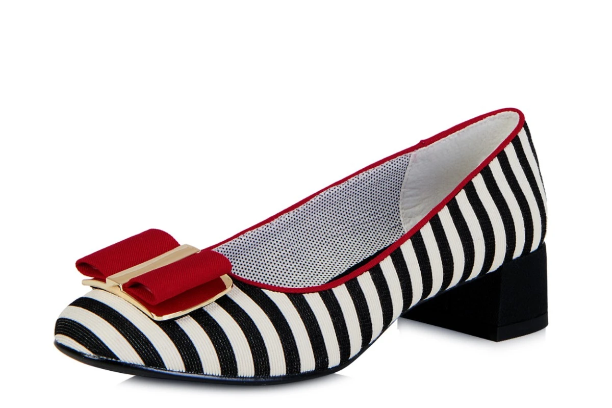 Ruby Shoo June court shoes feature a low block heel and round toe. The black and off-white stripe woven fabric upper provides a fashionable monochrome look plus a pop of colour with a bright red front bow and matching red trim. ย The chunky block heel is on trend for this season and the black rubber sole provides good grip. Ruby Shoo June shoes also have a polka dot fabric shoe lining and stylish metallic gold colour metal detailing on the front bow.