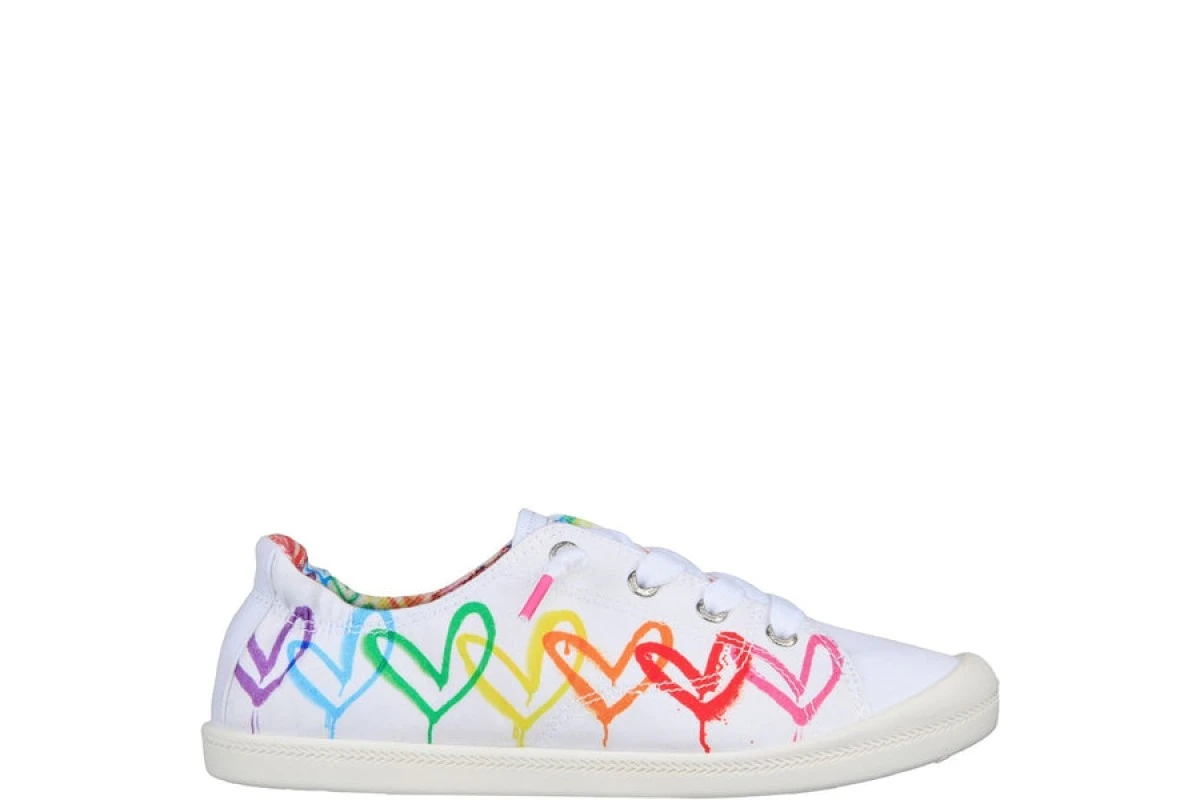 The soft terry fabric shoe lining and cushioned memory foam outsoles keep things comfy along with the addition of a lightweight and flexible white rubber outsole. The classic lace-up low-top design has front knotted laces for an easy slip-on fit and an on-trend white rubber toe-bumper. Skechers Bobs Beach Bingo Luv Almighty women’s vegan fashion trainers have a subtle scrunched back for a stay-put fit, with a soft cushioned heel panel and contoured arch support for extra comfort. The Bobs fabric logo badge on the tongue features the J Goldcrow signature and completes the streetwear inspired design.