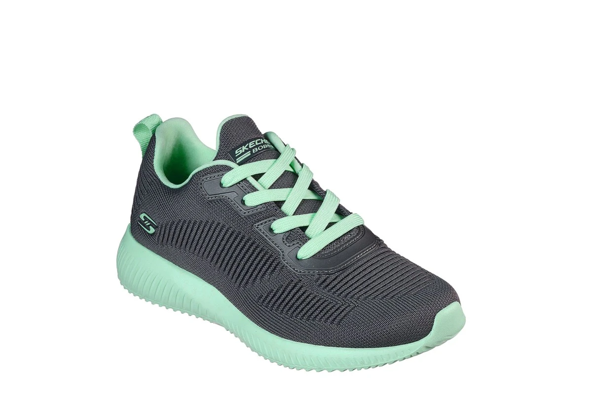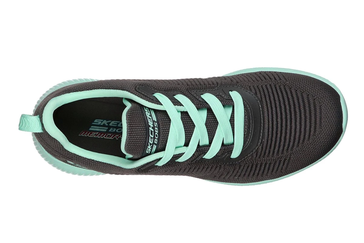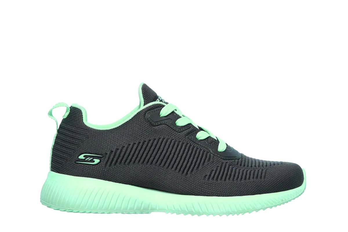 Skechers Bobs Squad Summer Haze women’s fashion shoes have a full length Memory Foam cushioned insole teamed with a shock absorbing contrasting mint colour midsole, plus a lightweight mint rubber traction outsole for ultimate flexibility and comfort. The padded collar, smooth fabric shoe lining and a concealed 1.25 inch heel with a tapered mid-foot design add to the comfort.