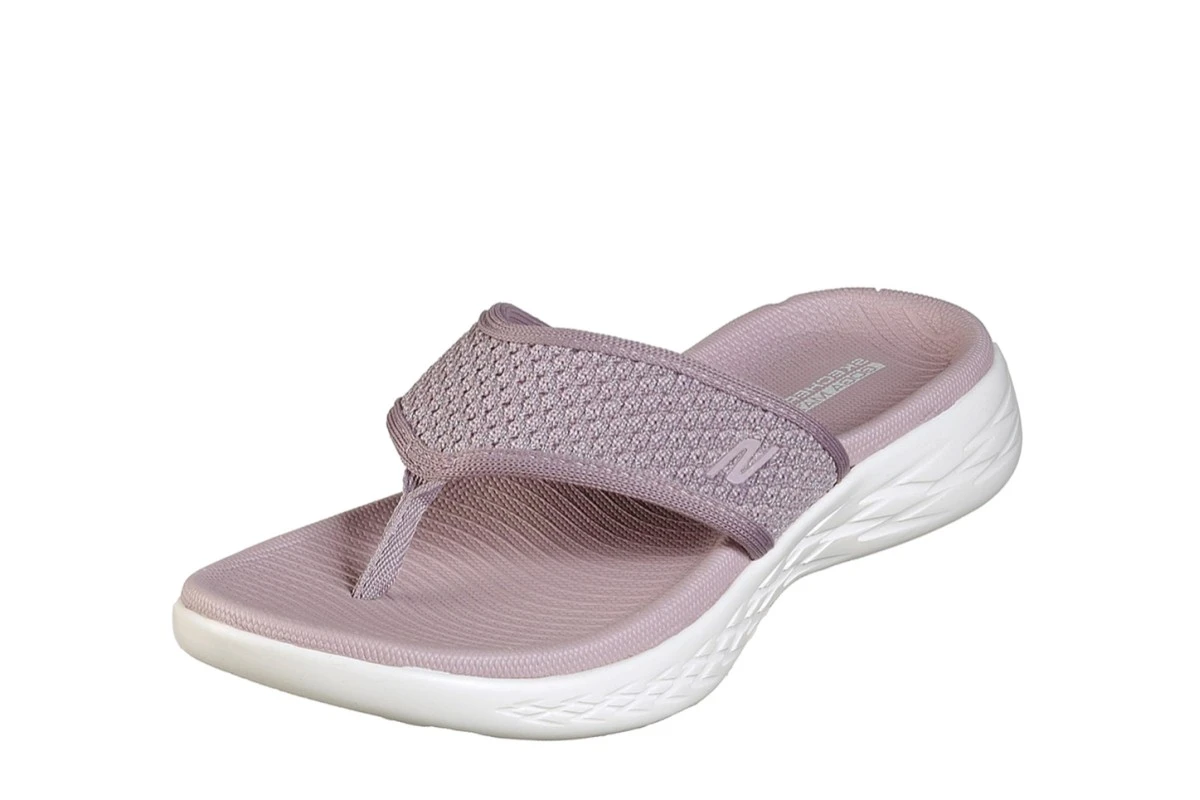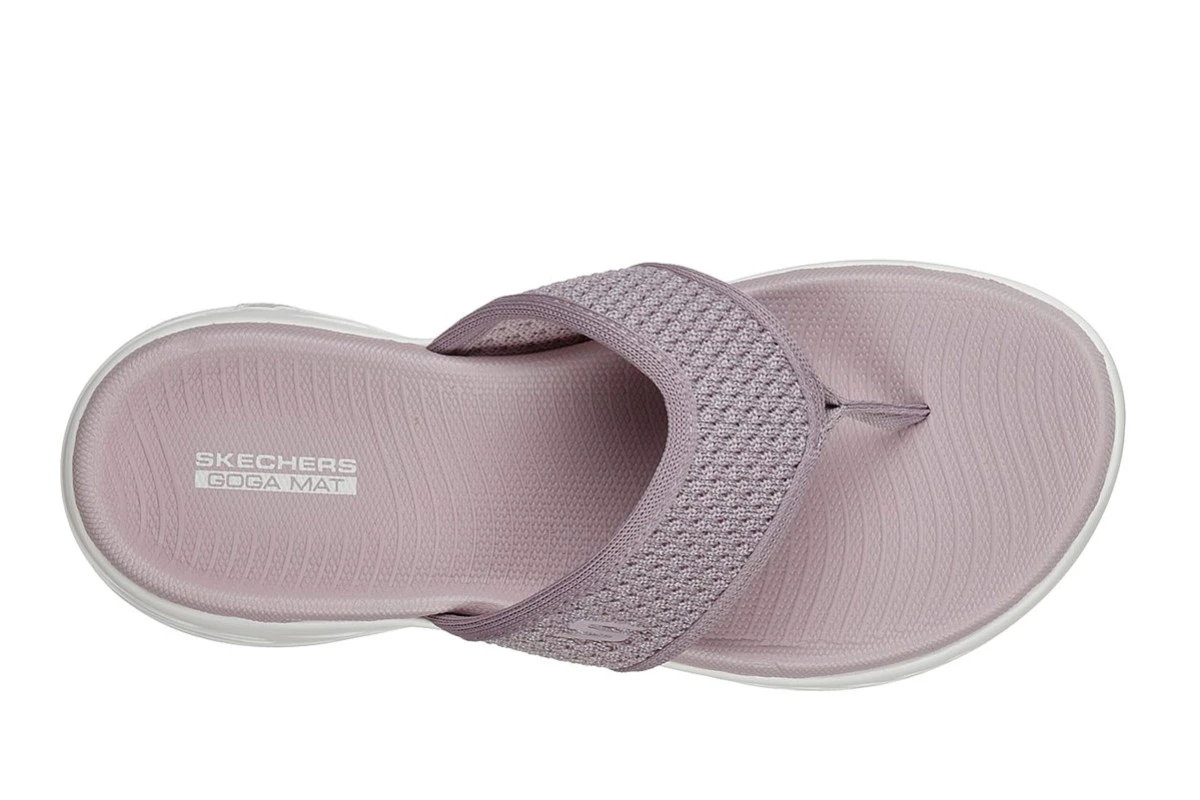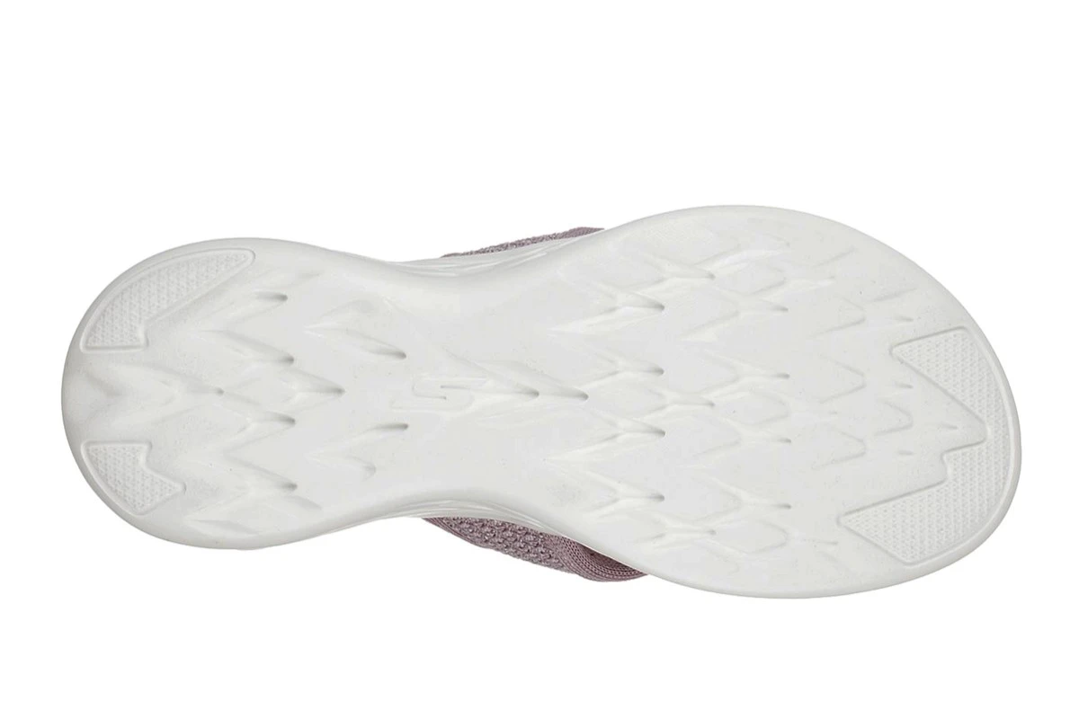 The matching lilac colour contoured and textured Goga Max cushioned footbed provides unrivalled comfort – like feeling the squish of a Yoga mat beneath your feet for comfort, support and shock absorption. The very low wedge heel adds to the comfort and the simple Skechers ‘S’ logo on the side of the thong strap completes the sporty look.