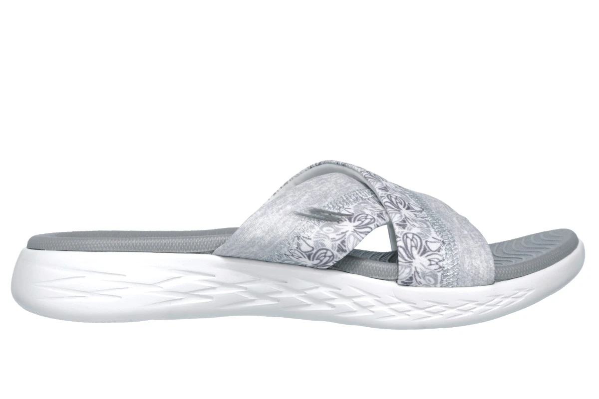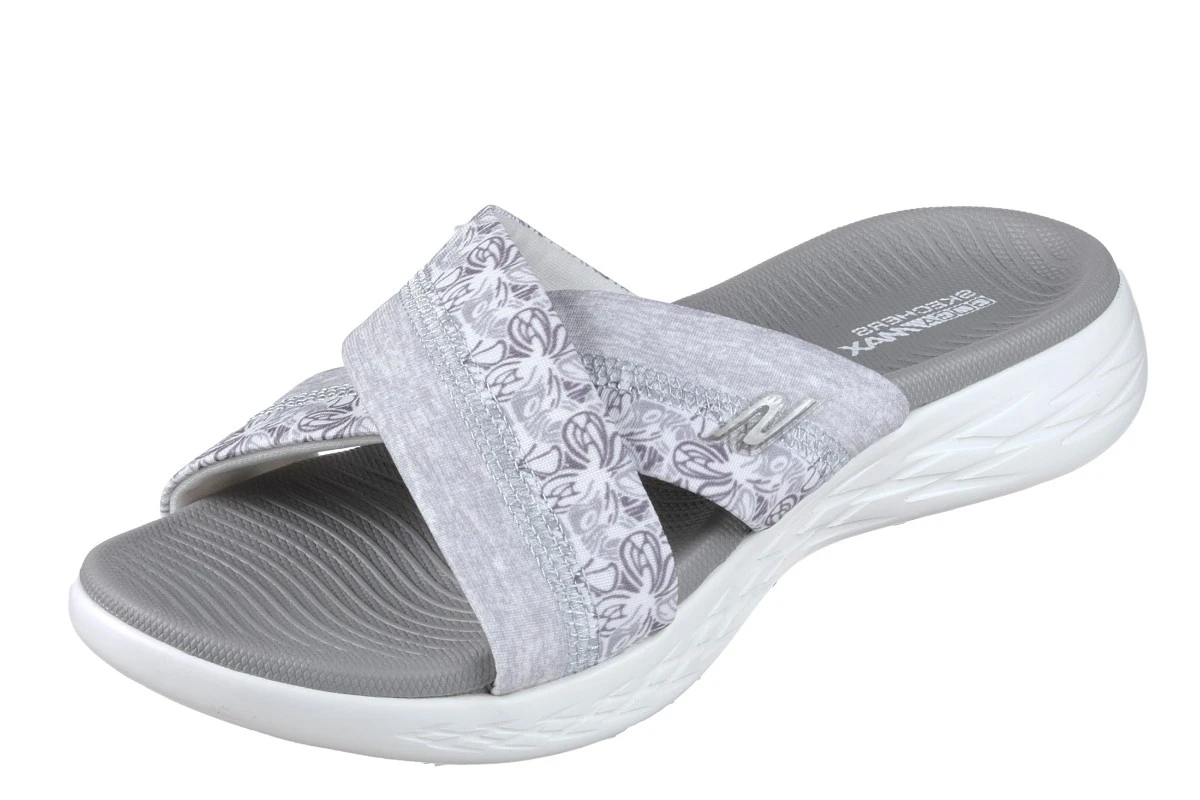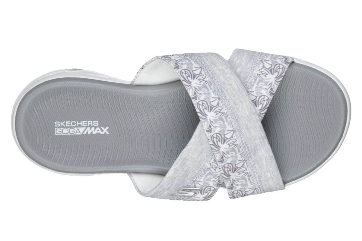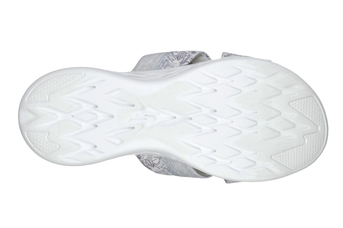 These women’s comfort sandals have a Goga Max grey colour cushioned and textured footbed that creates a truly unique walking experience – feel the squish of a yoga mat beneath your feet for comfort and support. Engineered to be long lasting and provide new levels of comfort all summer long. The Skechers ‘S’ logo appears on the side of the strap and the very low wedge heel provides additional comfort.
