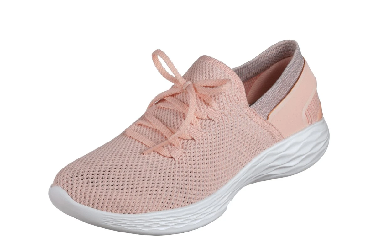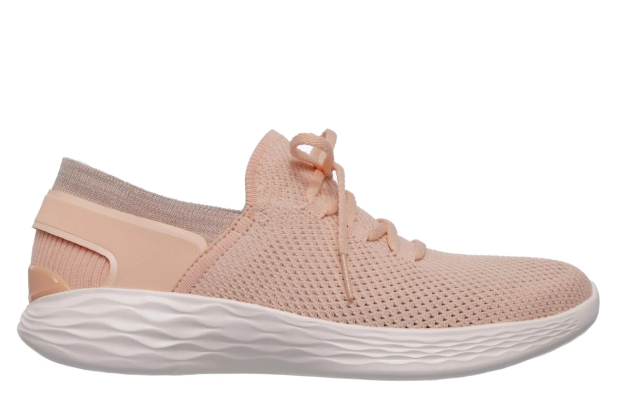 You by Skechers is a new collection combining lifestyle and wellness. The product moves and adapts throughout your day. Versatile. Active. Designed for you. You Spirit are designed for comfort with a soft and flexible mesh fabric upper and a simple slip-on design. The soft pastel peach colour and breathable fabric upper is perfect for the summer, with mock laces at the front of the shoe and a soft and stretchy sock-like fabric collar.