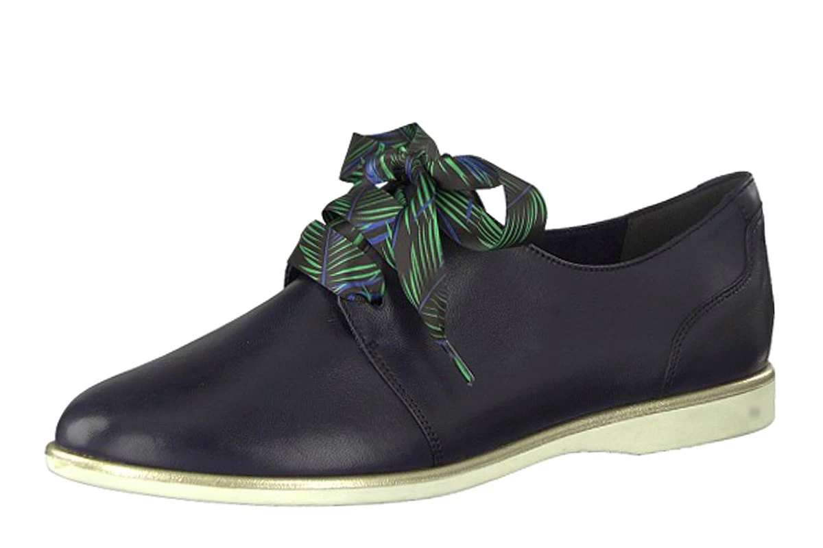 These new Tamaris 23209 women’s fashion shoes combine style and comfort. The navy colour soft genuine leather upper has a simple lace up design with on-trend ribbon laces and a classic round toe. The shoes come with green tropical leaf print satin ribbon laces and plain navy ribbed laces so you can easily change up your look. These women’s oxford shoes have a white rubber sole that provides good grip and added flexibility plus a very low heel. The subtle metallic sole trim completes the understated design and the cushioned ‘touch it’ footbed provides all day comfort that adapts to your foot shape.